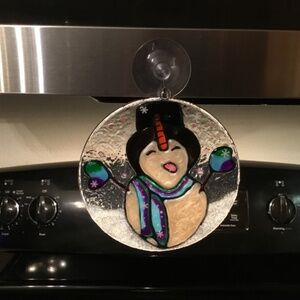 New, Hand painted Stained glass Snowman catching a snowflake with his tongue. Painted with Glass paints on 6 inch acrylic circle. Indoor use only. Great for Windows or glass doors.