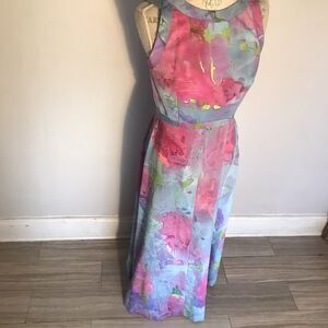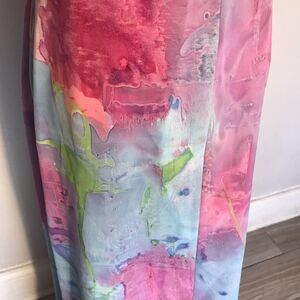 Hand painted Vtg 70s Tegaki pink abstract watercolor psychedelic maxi dress gown.