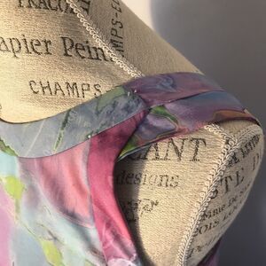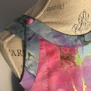 Colors are vibrant, somewhat like abstract tie dye. No size tag. Reminds me of an 8-10, but check measurements before purchase. Has one pink button on one shoulder. In great condition for age. Some mild pilling.
