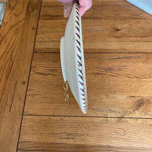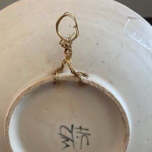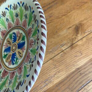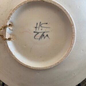Artist signed hand painted 8" shallow bowl/plate. This is a pretty multi-colored design and is prepared with a hook on the back so it can be hung if you wish. Also a great display dish. There are 3 small chips in the center of the plate - please see pictures circled in red. Honestly, they blend in and it's very hard to notice but I did want to point them out. Smoke free home! Quick shipper! Please feel free to ask me any questions you may have.