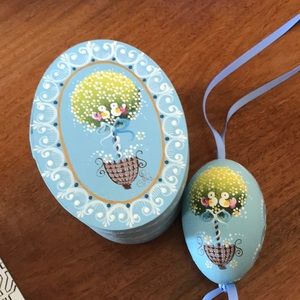 Beautiful hand painted with artist signature. Bird design is painted on both sides of the egg. Has blue satin ribbon to hang. Comes with beautiful box. In beautiful condition, has been meticulously stored.