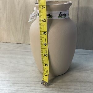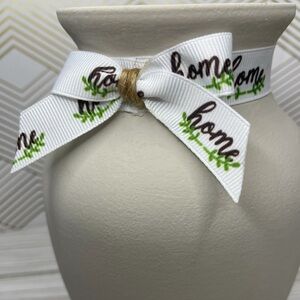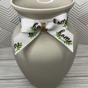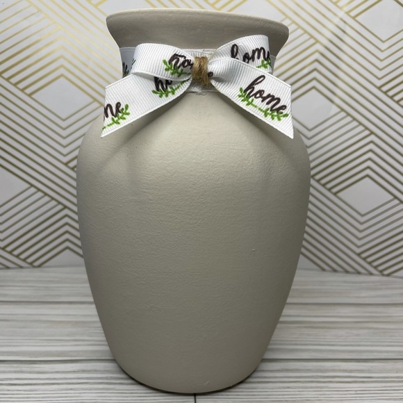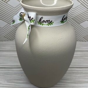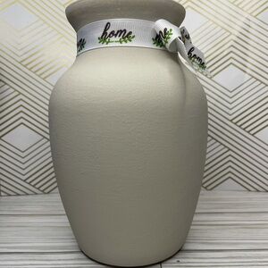 hand painted glass vase with decorative Sonya with the word home the vase is cream color with a somewhat rustic texture as shown in the photo
