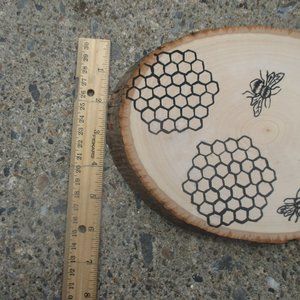 Hand painted honey bee wood slice. Measures about 9x6 inches. Some lighter coloring near one of the bees and between 2 of the honey combs see pictures for more detail. No hanger on the back.