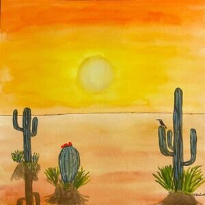 Handmade watercolor painting of a gorgeous evening desert sunset scene in shades or orange, yellow, and gold, with a foreground of various cacti and a desert wren