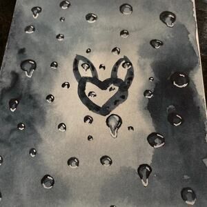 Handmade watercolor painting of raindrops on a windshield or window with a whimsical heart with bunny ears drawn by a finger in the fog on the glass. The realistic raindrops almost pop off the page.