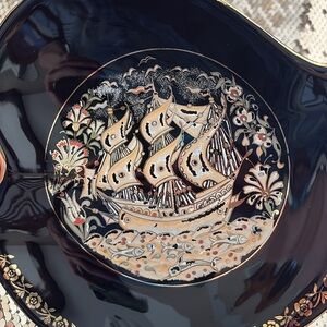 This exquisite black and gold art plate features a detailed ship design, perfect for adding a touch of elegance to your home decor.