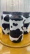 3 hand painted glass jars on the outside have a layer of white paint with cow style spots. These jars give a great rustic farmhouse look on the spout of the jar it has gray ribbon that says welcome home, the jars are made of recycled glass it is perfectly described in the photos.