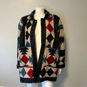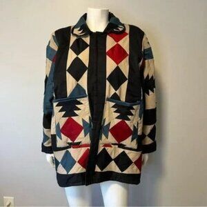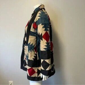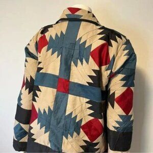 This cute lightweight jacket is the perfect piece for art to style your cooler weather wardrobe or as a unique one of a kind gift for someone special in your life. It was custom handmade. It has open front and drop sleeves. Super soft quilt jacket featuring a checkerboard flying geese pattern, piped in coordinated colored fabric. Quilts are deconstructed, hand-cut, carefully mended and patched back together into a finished jacket complete with stylish popped collar, coordinated bias piping, fabric bound seams. Inside is lined with white fabric. Two large hand pockets at the front of the jacket. They are modern heirlooms to be loved and enjoyed today and then carefully put away, for the next generation. One size, listed as large. would fit small to large.