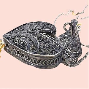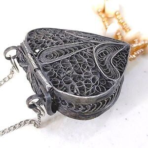This necklace features an open woven antiqued silver metalwork heart with a hinged top that opens for keeping small treasures. The detail on this piece is stunning. Finished with cream beads and a bright silver chain.