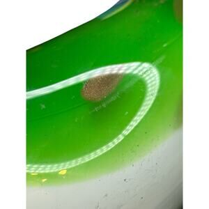 Add a pop of whimsical charm to your collection with this stunning hand-blown art glass duck! Featuring vivid green, amber, white, and black coloring with a glossy finish, this piece has a Murano-style aesthetic and is sure to stand out on any shelf or mantel.