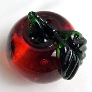 Hand-Blown Red Glass Apple Paperweight Green Stem Vintage Fruit Sculpture 3”
