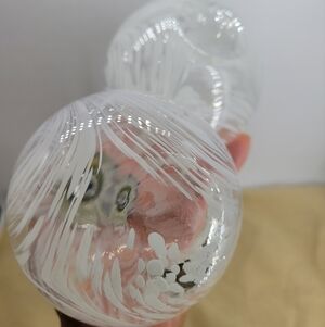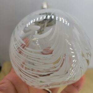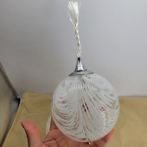 ● This listing features a beautiful set of two vintage hand-blown glass oil lamps. Each lamp showcases an elegant swirled white pattern, creating a mesmerizing visual effect. The lamps are spherical in shape and topped with a metal wick holder, adding a touch of classic charm. These oil lamps are perfect for adding a decorative accent to any room or for use during power outages. The craftsmanship and unique design make them a standout addition to any collection. Ideal for collectors or as a thoughtful gift
