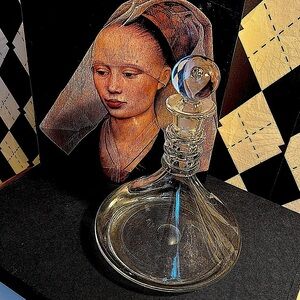 Elevate your bar or living space with this sophisticated vintage decanter, showcasing hand-blown craftsmanship and a wide base for optimal aeration. A pontil mark on the base, along with a small air bubble, confirms its artisan origins and adds to its unique charm.