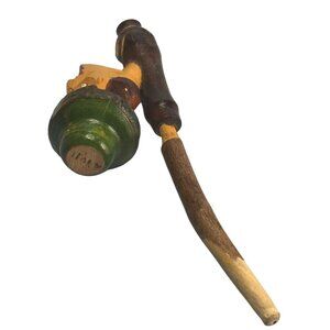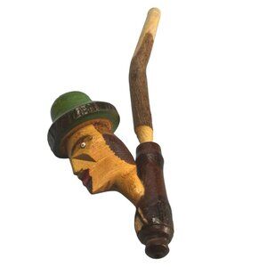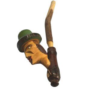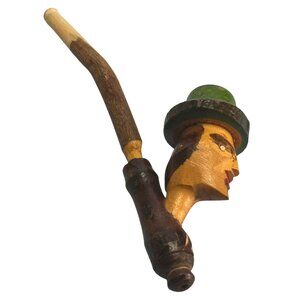 This mid-20th century Italian hand-carved character pipe features a caricatured wooden face and a green painted hat, showcasing artisanal craftsmanship. Likely intended as a decorative collectible rather than for smoking use, this pipe is a testament to folk art traditions. The body combines natural wood tones with colorful painted elements, making it a unique souvenir from the era.