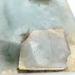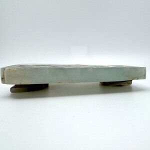 This antique jade inkstone showcases intricate hand-carved landscapes, featuring trees and mountains. Its aged patina adds to its charm and historical significance.