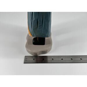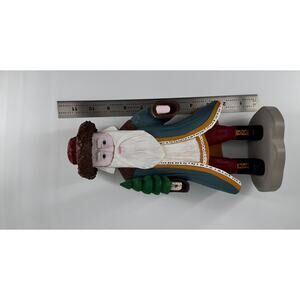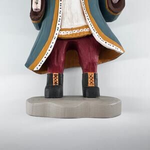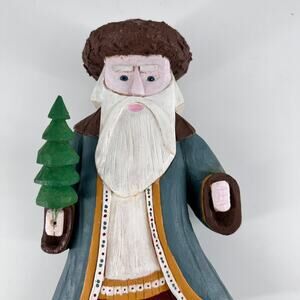 One-of-a-kind hand-painted Santa Claus figurine by artists Dave & Pat Justice, dated 10/1998 and numbered #24. This folk art-style carving features Santa in a long green and gold coat, red pants, and a tall fur hat, holding a small evergreen tree. Made of carved and painted wood with visible tool marks and brush strokes, this piece exudes primitive and Americana charm. Signed and dated on the bottom. A beautiful addition to a rustic Christmas decor collection or artisan holiday display.