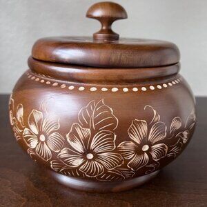 Hand-Carved Teak Wood Trinket Box from India | Floral Engraved Lidded Bowl 6.75”