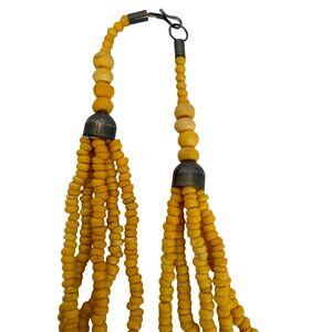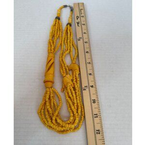 This intricately designed hand-carved necklace features multi-strand yellow beads with elephant and tribal-inspired accents, offering a unique and artistic aesthetic.