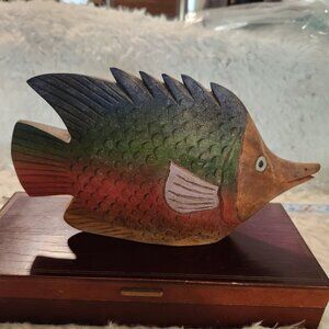 This vintage hand-carved wooden fish sculpture boasts vibrant colors and intricate details, making it a unique decorative piece for collectors and enthusiasts.