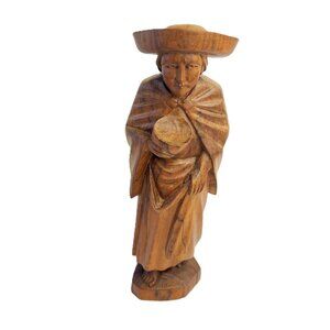 Bring a sense of serenity and tradition to your space with this hand-carved wooden monk figurine. Standing 12.5 inches tall, the figure holds a ceremonial bowl and wears a flowing robe and wide-brimmed hat—evoking the quiet dignity of spiritual devotion. Whether displayed as cultural art or religious decor, this vintage sculpture adds depth and meaning to any collection.