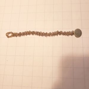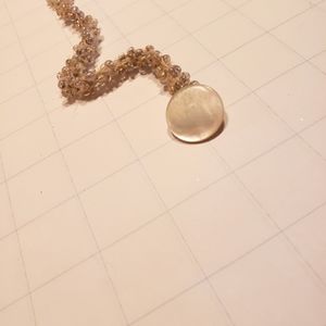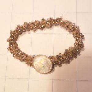 AJ Nelly original design. I developed a new technique for bead crochet so the beads go all the way around. This is handmade beaded jewelry made with jute and iridescent golden colored beads. I use Vintage buttons for the closures. This one has a large Mother of Pearl Button. It is about 7.5" long.