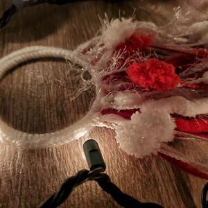 3. red yarn on the top circle, apprx 56" total length and apprx 6" width (more full)