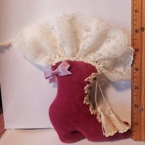 Large ( approx. 7" tall) Victorian boot - sumptuous fabric, custom hand crocheted or other trim, pearls for buttons, handmade tassels, hand stitched lace ruffle, decorative bow and hanging loop.