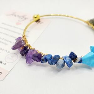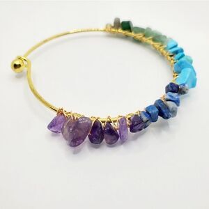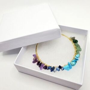 Hand Crafted Natural Stone Chip Bangle on a Golden Copper Wire! This amazing Bracelet is bright and colorful! The stones consist of Howlite, Aventurine, Amethyst, and Lapis Lazuli. It is 100% lead and Nickel Free. It an absolutely stunning piece that would look great on your wrist! It would even be a perfect gift. It has a clasp closure which makes it easy to put on and allows it to fit most wrist sizes!