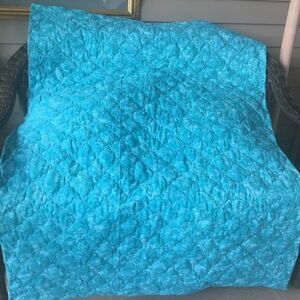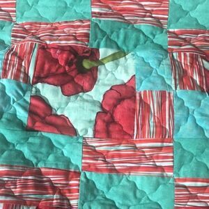 Brand new. Zoom in to see all the gorgeous quilting on this handmade 54” x 40” quilt. Aquas mix with reds and a touch of crepes - stripes mix with flower print mixed with solids. Just beautiful.