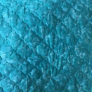 Made of all new 100% cotton fabrics in a smoke free home. Care instructions come on my tag. The back side is a coordinating creme on aqua botanical print and it really highlight the actual quilting.