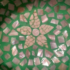 Bowl made from a coconut shell and lined with a mosaic of abalone sea shells