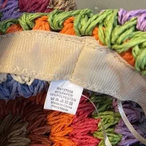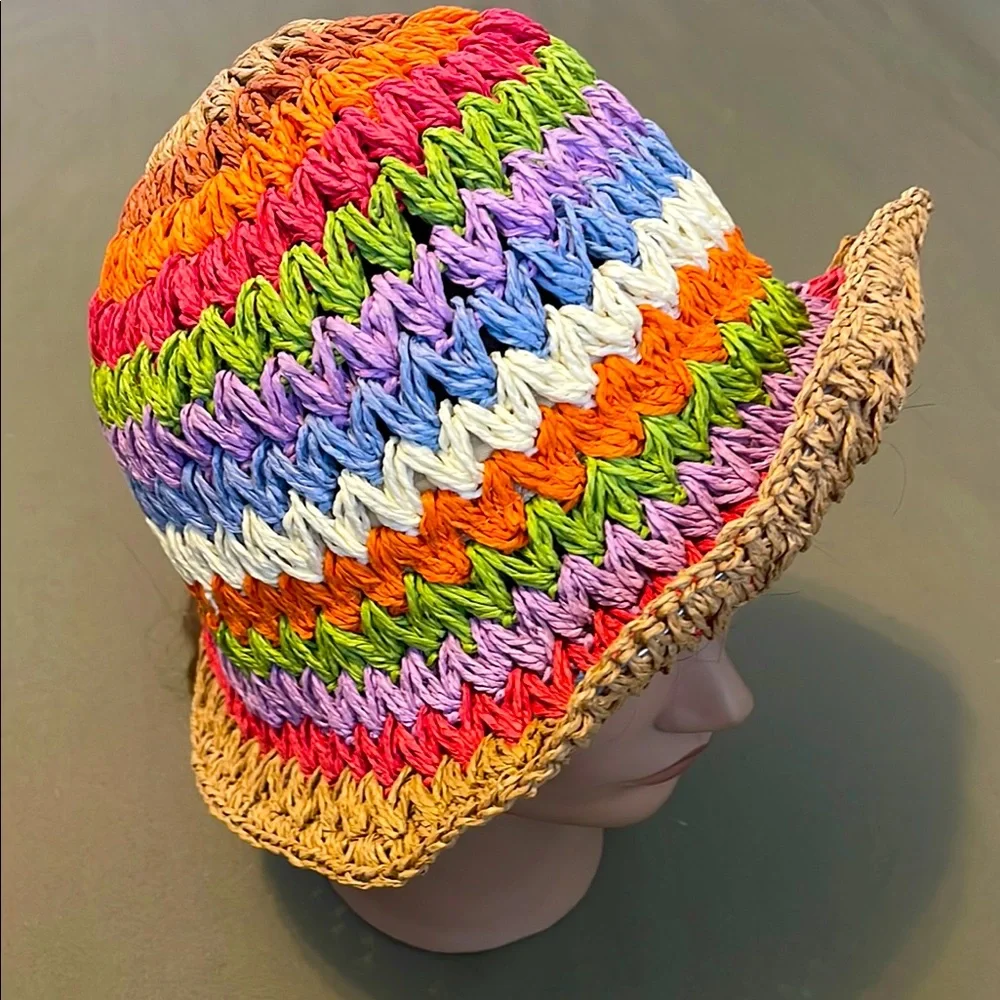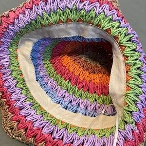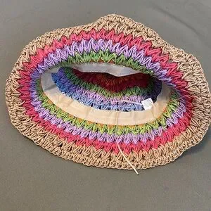 Bright multicolor crocheted bucket hat. Features alternating rows of pink, orange, lime green, lavender, blue and white. Natural raffia brim adds a casual finish. Lightweight and colorful summer accessory.great new condition