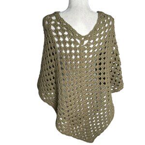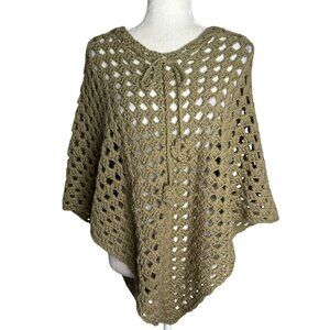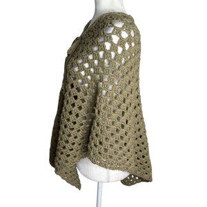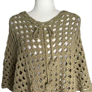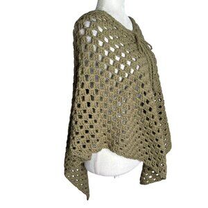 Hand-Crocheted Olive Green Open Knit Poncho Tie-Front Accent Festival Cape