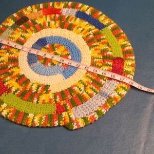 Vibrant crocheted round rug with a mix of colors. Perfect for adding a pop of color to any room.