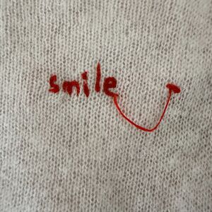 This cozy cashmere vest is not just warm but also uniquely charming! Originally new, it had two tiny holes that have been lovingly embroidered. One features the word "smile" ending in a cheerful curve, and the other has a tiny heart. Perfect for adding a touch of joy to your wardrobe! 💖