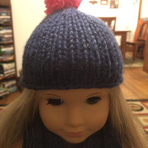 Hand-knit 18-inch doll hat & scarf set. Navy blue and fuschia pink. Fits standard American Girl dolls. Scarf is 22 inches long. Hand-knit by me. Doll NOT included.