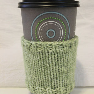 Hand-knit heathered light green coffee cup cozy. Fits standard travel coffee cups as pictured in picture #2.