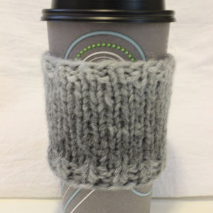 Hand-knit ombre gray coffee cup cozy with a bit of sparkle. Fits standard travel coffee cups as pictured in picture #2.