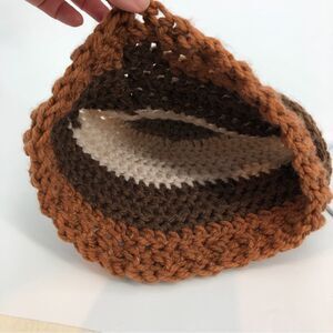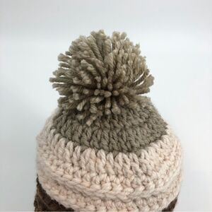 Handknit pom pom beanie. Multi colored brown, tan, cream. Womens one size. Long sought to roll the end too.