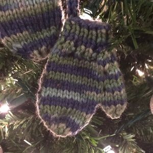 Adorable tiny hand-knit mittens Christmas ornament. Blue/green mixed colored yarn. Mittens measure approximately 3.25 L x 2.5 W.