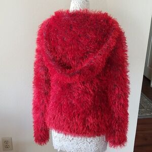 Gorgeous hand knit sweater, using eyelash yarn, primary color is red with a multi color underlying. Zipper closure, with plenty of stretch. Very warm, and very boho! I purchased this at a ski resort in Breckenridge, Colorado. H1.4