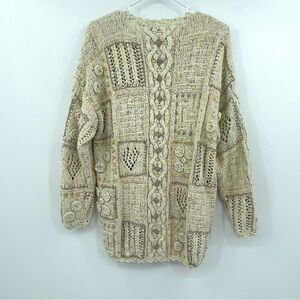 This cozy vintage hand-knitted sweater features a crewneck and decorative buttons down the front. Made with a soft blend of 5% wool and 10% angora, it comes in a lovely cream and tan color combination. In great condition. Previously owned. Smoke-free and pet-free home.