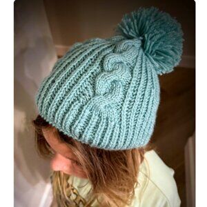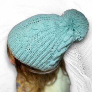 Cozy handmade knitted hat crafted from soft, warm yarn in a delicate pastel blue shade. The beanie features a stylish cable knit pattern and a fluffy pom-pom on top, offering both comfort and charm. Perfect for chilly days, casual wear, or as a thoughtful handmade gift.