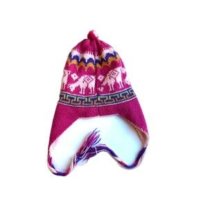 Hand-Knotted Chullo Winter Magenta Pink Reversible Alpaca Wool Blend W/ Earflaps. Original hat hand knotted with Alpaca Wool Blend. Soft and warmth, exclusive design, depicts llamas and traditional figures from the Inca Culture.
