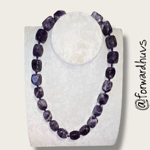 This necklace is composed of genuine, polished amethyst stones in a chunky, substantial format, offering both visual impact and material value. Each stone is individually hand-knotted, a technique that not only enhances durability but also reflects artisan-level craftsmanship. The silver tone lobster claw clasp provides secure wear and complements the rich purple hues of the stones.