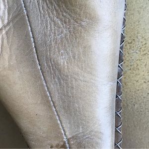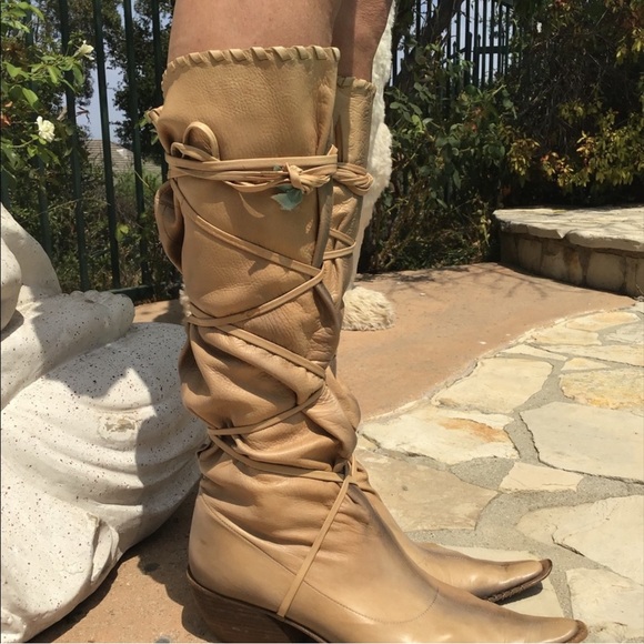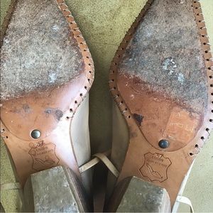 These beauties were hand-made in Spain. Original and unique in styling and color. Buttery soft dove grey ombré on a cream base. There are some scuffs and marks shown in pics, but they don’t distract from how beautiful these boots are. And very comfortable. Tie to fit!