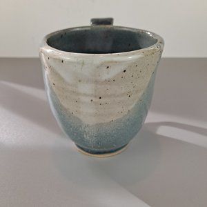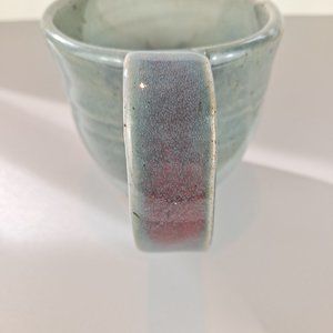 Nice handmade pottery mug. Glaze: Light blue tones with a bit of cream and purple on the handle.