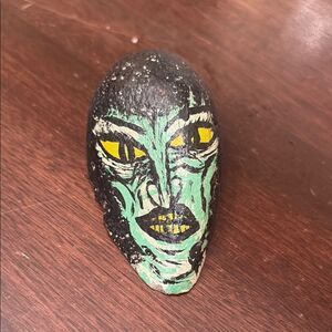 Unique hand-painted stone featuring an alien face. Vibrant green and yellow colors. About 4” long. Chip on back