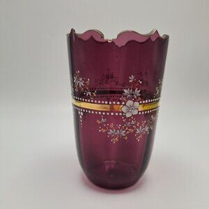 Hand-Painted Amethyst Enamel Floral Vase With Scalloped Rim