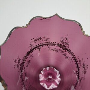This elegantly hand-painted vase features a striking amethyst hue and intricate floral design. Its scalloped rim adds a touch of sophistication to any decor.